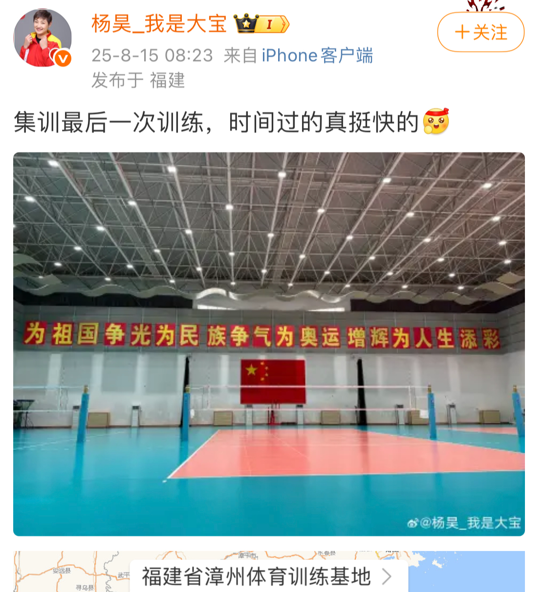 8月15日,随着出征世锦赛前的最后一次训练结束,杨昊用手机拍下空荡荡的场地,发到社交平台收获诸多点赞。照片中的一行大字格外醒目:为祖国争光 为民族争气 为奥运增辉 为人生添彩。